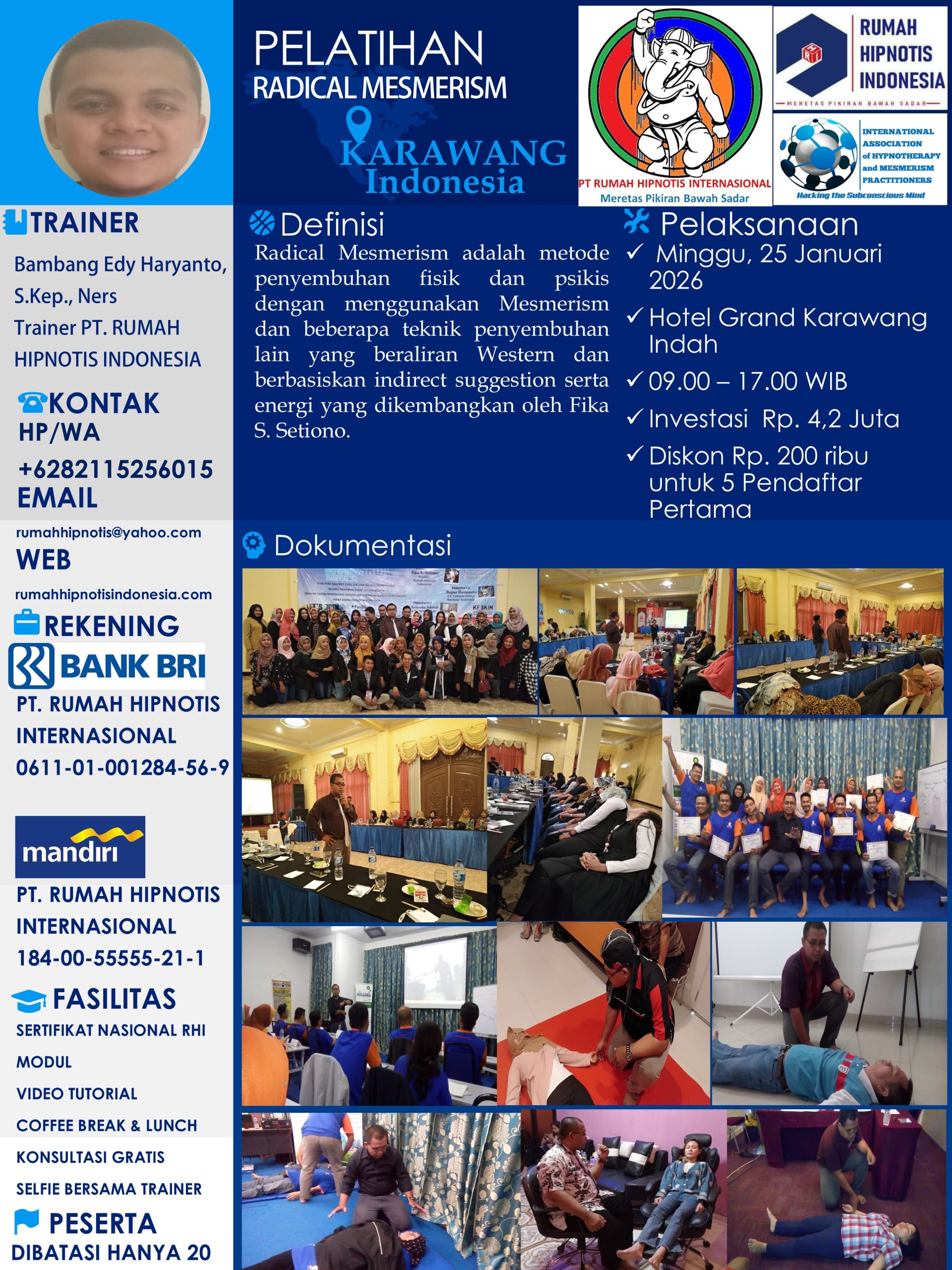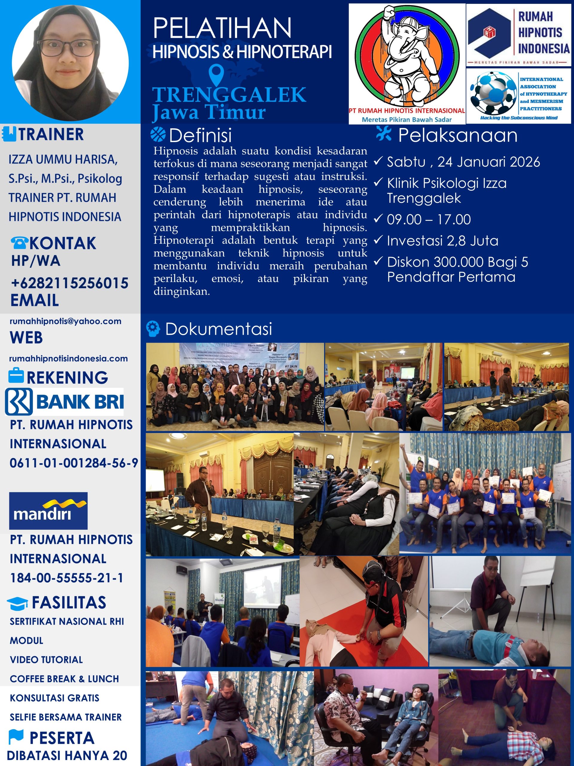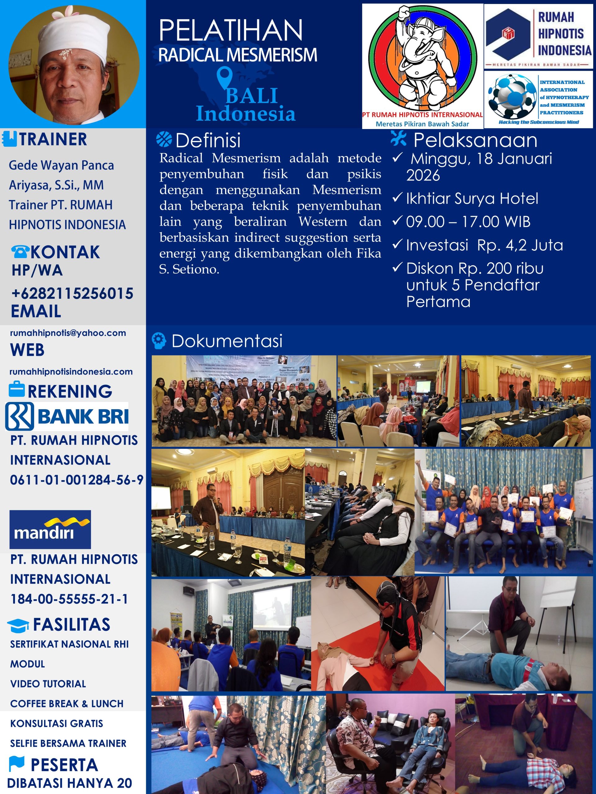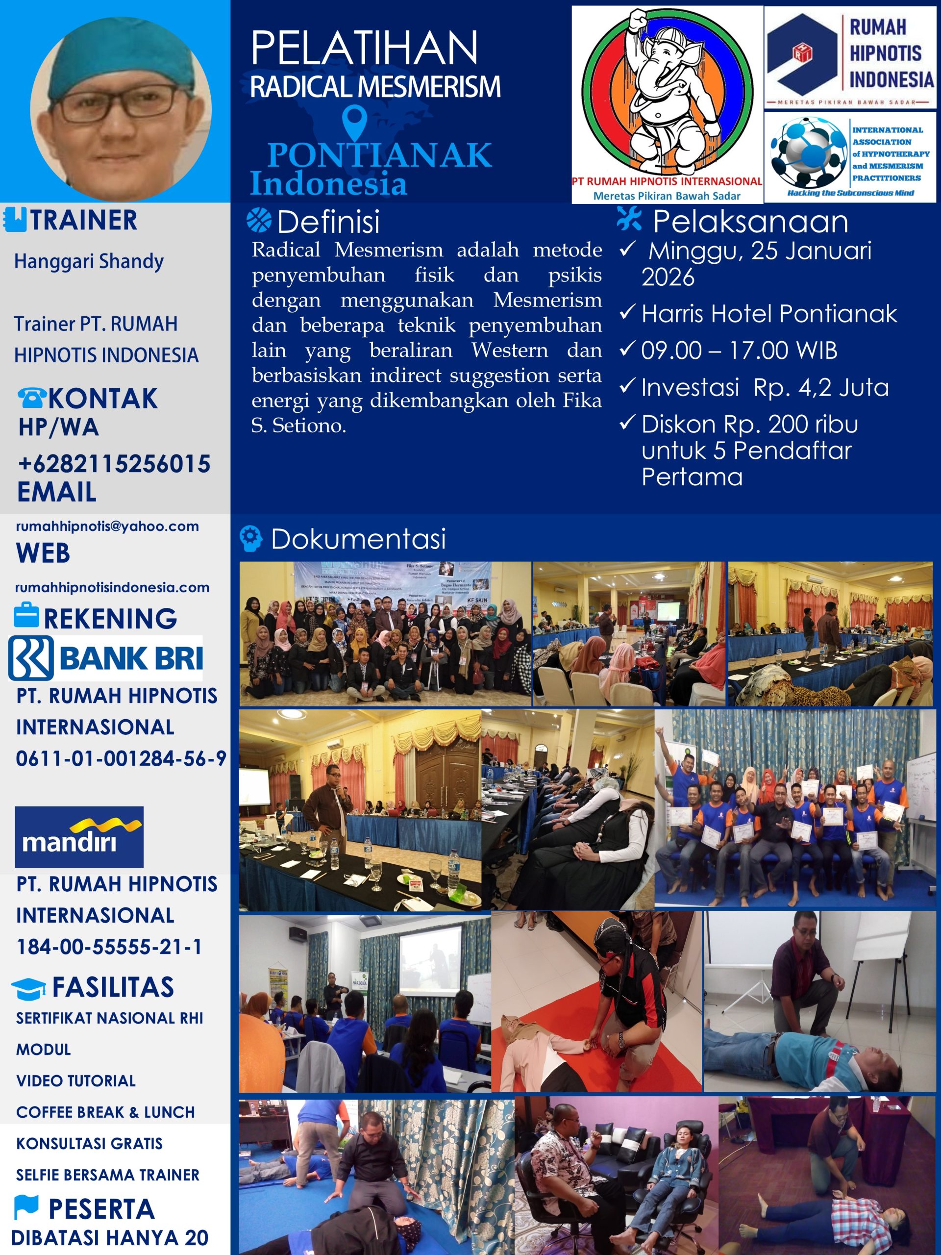 Jika Anda ingin mendapatkan layanan terapi profesional atau mengikuti program pelatihan bersertifikat internasional, silakan menghubungi kantor resmi RUMAH HIPNOTIS INDONESIA. Bersama kami, temukan kekuatan pikiran Anda untuk menciptakan perubahan positif dan kehidupan yang lebih bermakna.