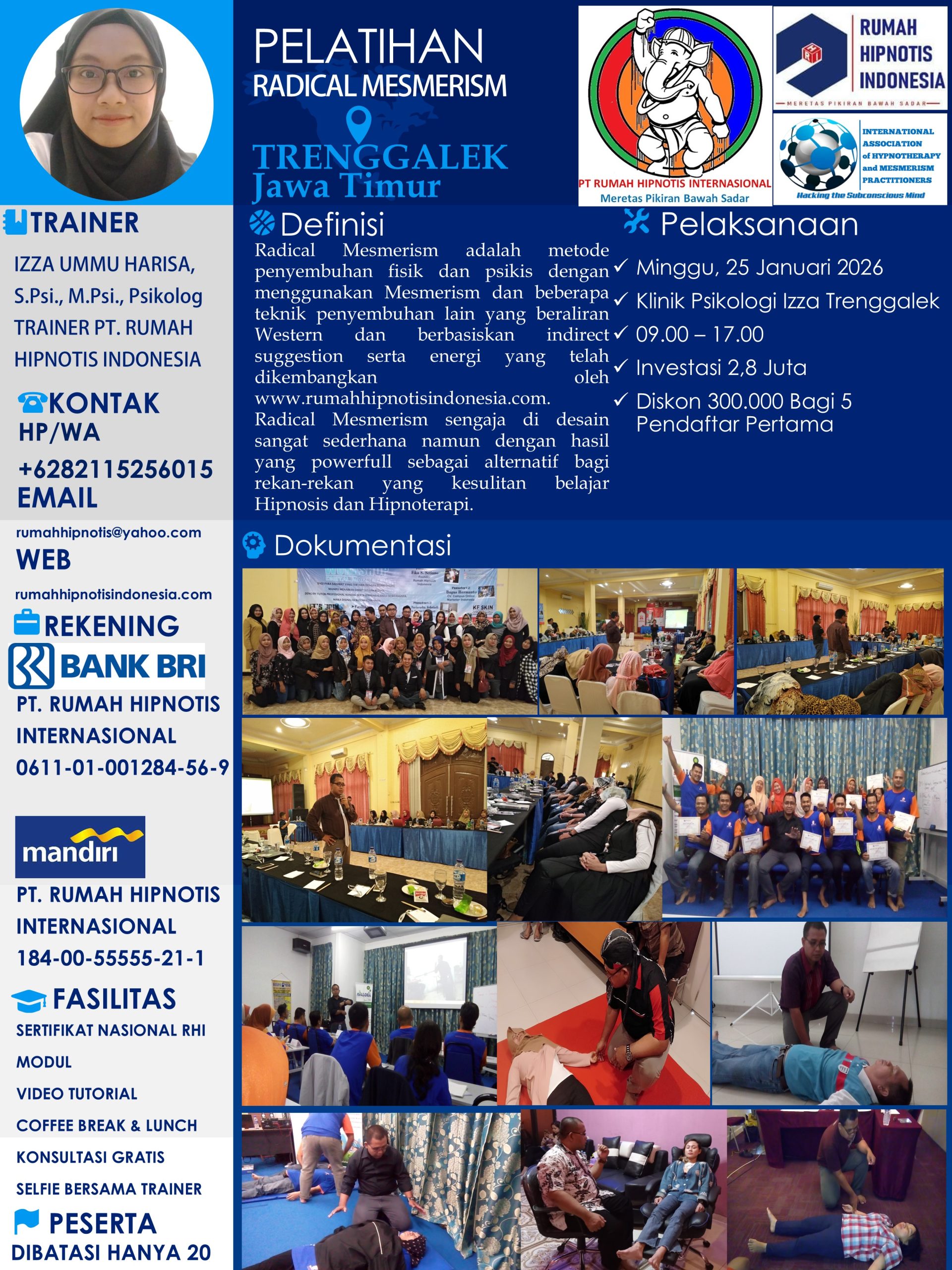 2. Surabaya (Moh Sholehun, S.Pd & Luqman Fathoni, S.Pd., M.Pd) – Sabtu dan Minggu, 27-28 Desember 2025 – Hipnoterapi & Radical Ericksonian – Hotel Surabaya Suites – Biaya 3,8 Juta.