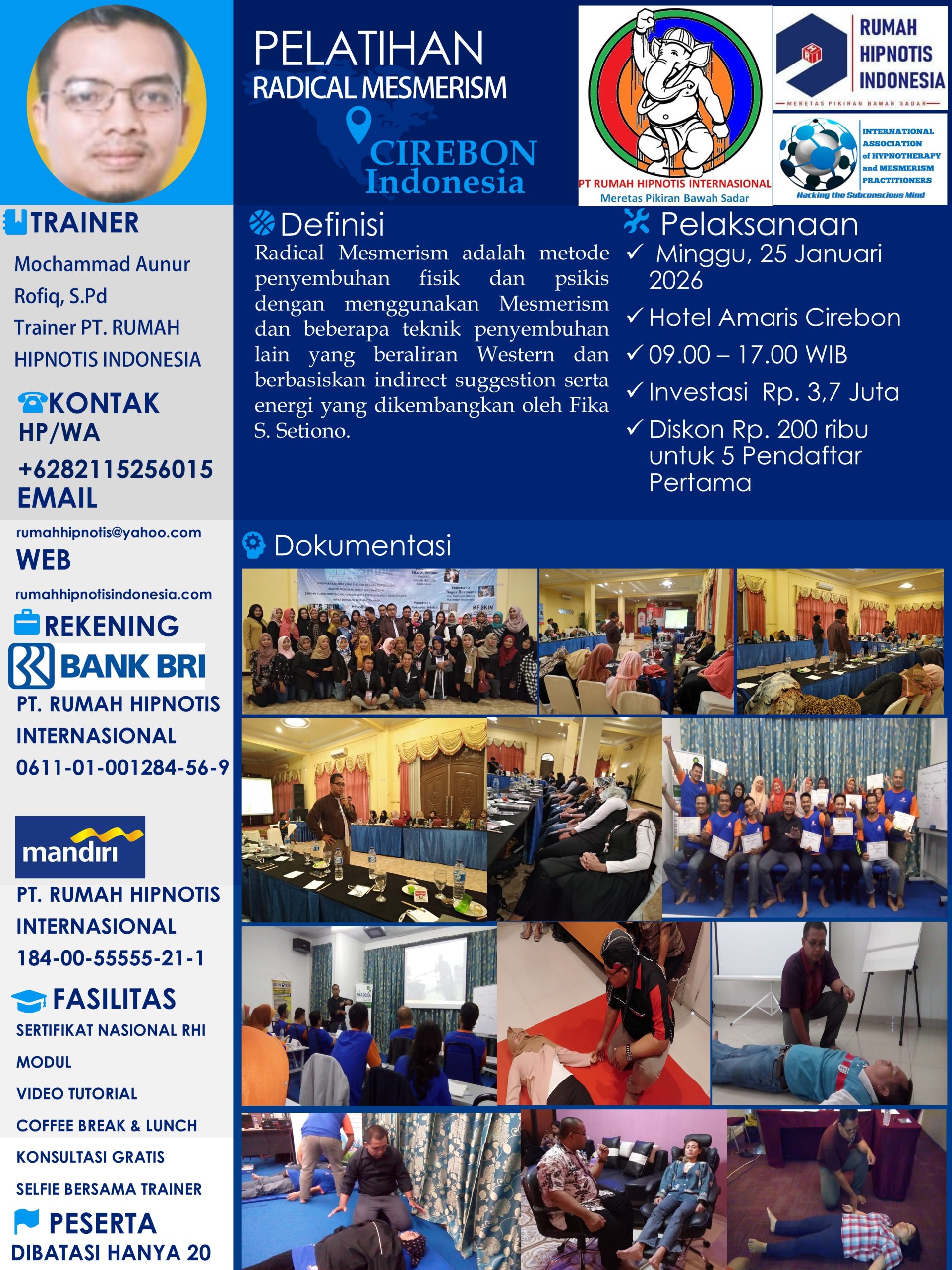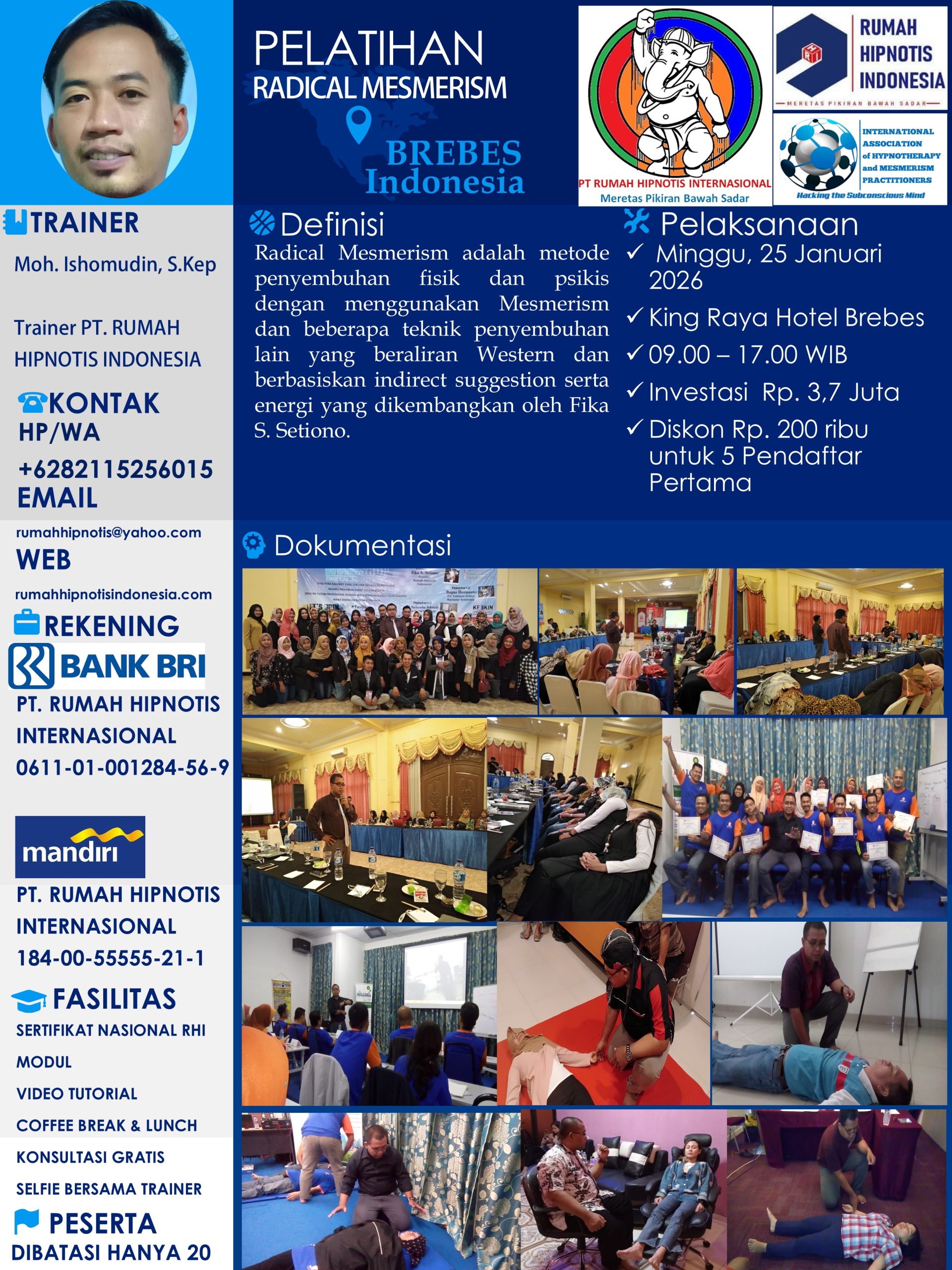 1. Malang (Moh Sholehun, S.Pd & Luqman Fathoni, S.Pd., M.Pd) – Sabtu dan Minggu, 20-21 Desember 2025 – Hipnoterapi & Radical Ericksonian – Hotel Pelangi Malang – Biaya 3,8 Juta.